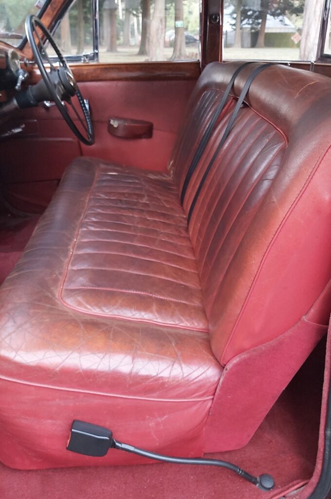 - Interior is nice and tidy - Lovely upholstery, new carpet. All of the burled-wood veneer that forms the dashboard and other interior panels, including the dual folding rear-seat tables, is original to the car and is in good, tidy condition. The four-spoke steering wheel aligns properly, as judged by the position of the emblem in the hub. Original headliner.