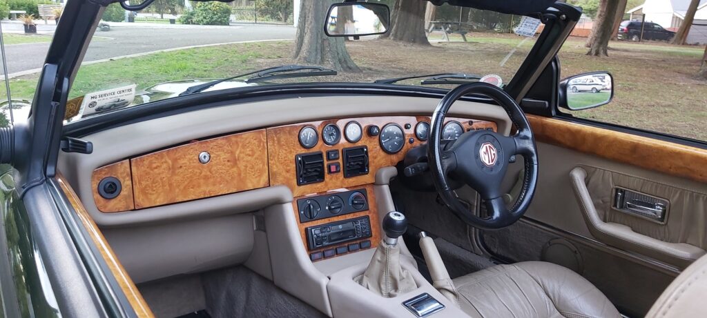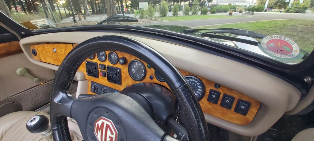 • The MG RV8 comes with disc brakes up front and drums in the back, over the 15-inch cast alloy wheels.