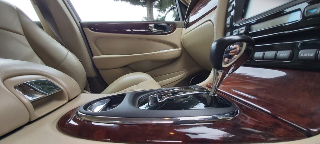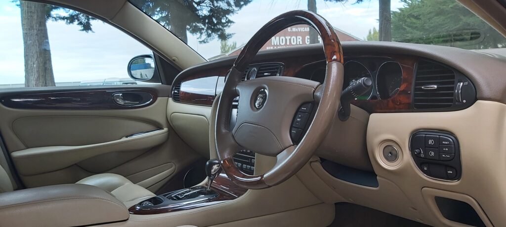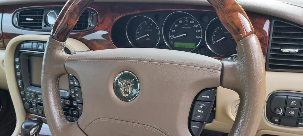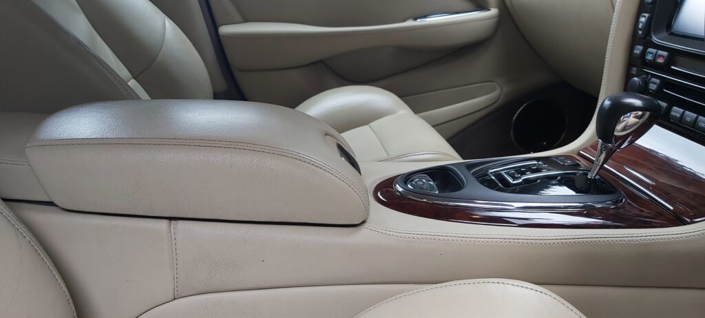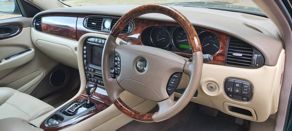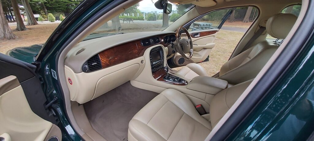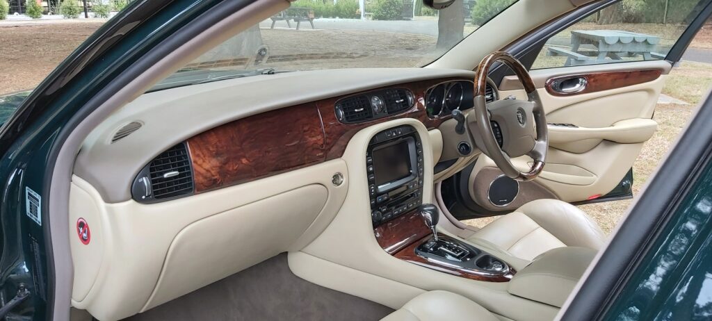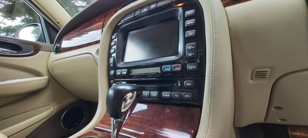 - Immaculate interior - good hood lining etc and comes with many gadgets, including LCD touchscreen. The cabin is sporty and elegant, featuring Jaguar’s most luxurious amenities at the time. The seats, the dashboard, most of the door panels, center console and steering wheel are covered in soft leather. The dash, center console, door panels all immaculate.
