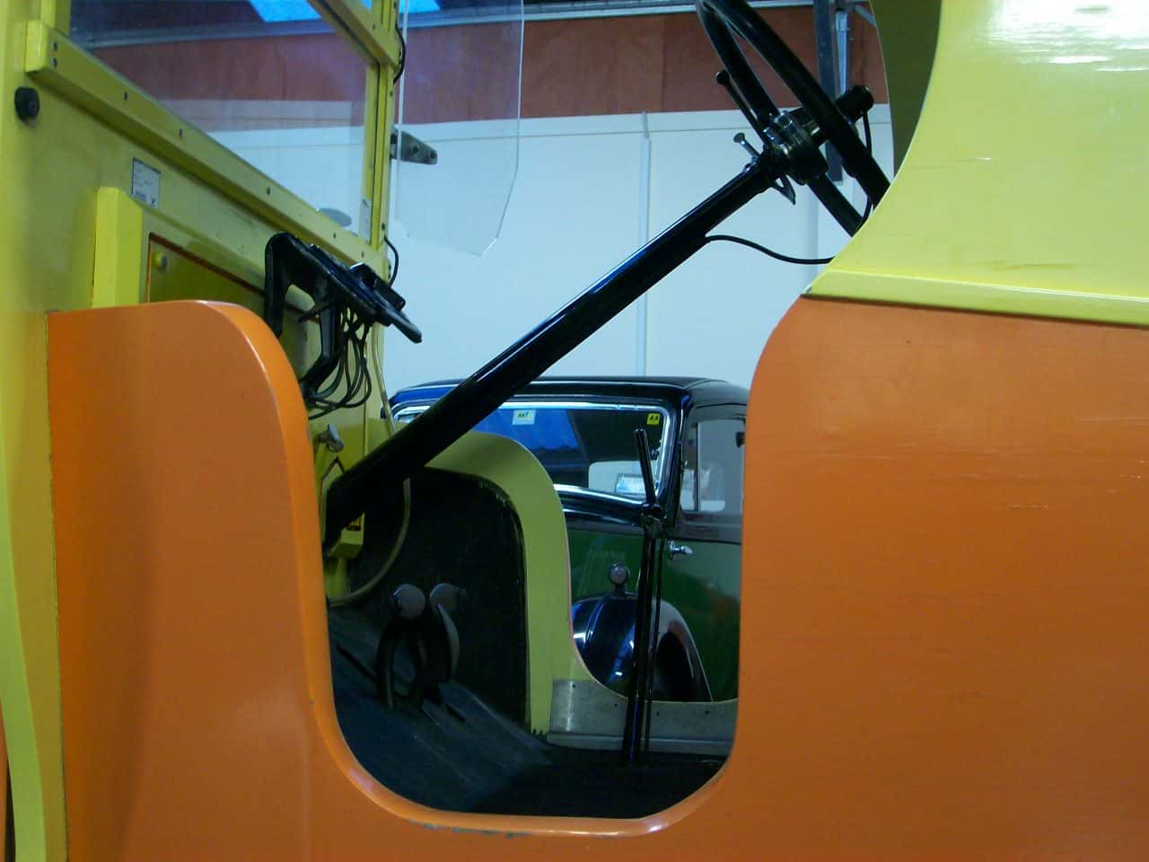 Transmission is controlled with three foot pedals and a lever mounted to the road side of the driver's seat. The throttle is controlled with a lever on the steering wheel. The left pedal is used to engage the gear. With the handbrake in either the mid position or fully forward and the pedal pressed and held forward the van enters low gear. When held in an intermediate position the van is in neutral, a state that can also be achieved by pulling the floor-mounted lever to an upright position. If the lever is pushed forward and the driver takes his foot off the left pedal, the van enters high gear, but only when the handbrake lever is fully forward. The van could thus cruise without the driver having to press any of the pedals. There is no separate clutch pedal.
